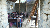邊界教學點:現使用校舍是2004年建造的未完的石草房,當時由於資金緊缺導致學校不能完全建成。現校舍無門、無窗、無瓦,只有茅草屋頂。兩間教室共35平方米,不能遮日避雨,如遇下雨就得停課。